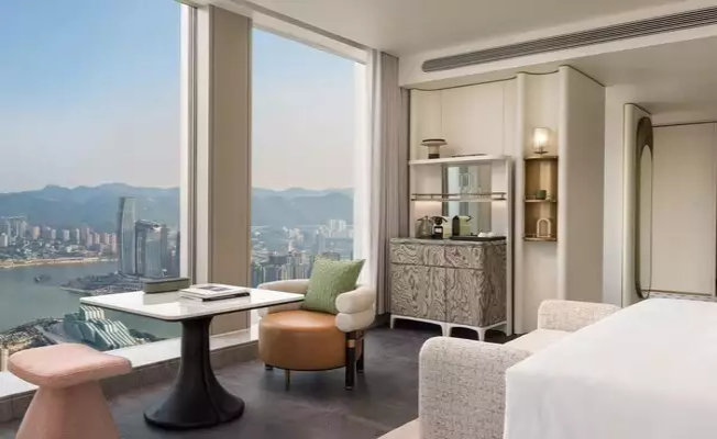 酒店坐享51-66层浩瀚高空,直面重庆城市天际线,视野串联起由远及近的朝天门、千厮门、曾家岩三座大桥,更坐拥两江交汇奇观、重庆大剧院、朝天门码头、来福士广场等城市标志性美景。宾客更可于客房的轩窗内,沉浸式享受重庆无人机常态化展演的至臻视觉盛宴。